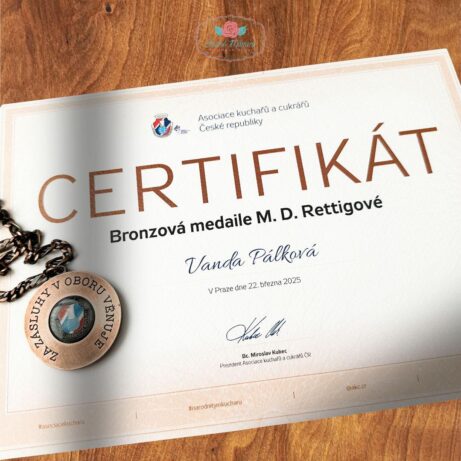 V březnu 2025 jsem získala diplom a bronzovou medaili M. D. Rettigové od Asociace kuchařů a cukrářů ČR za zásluhy v oboru.
